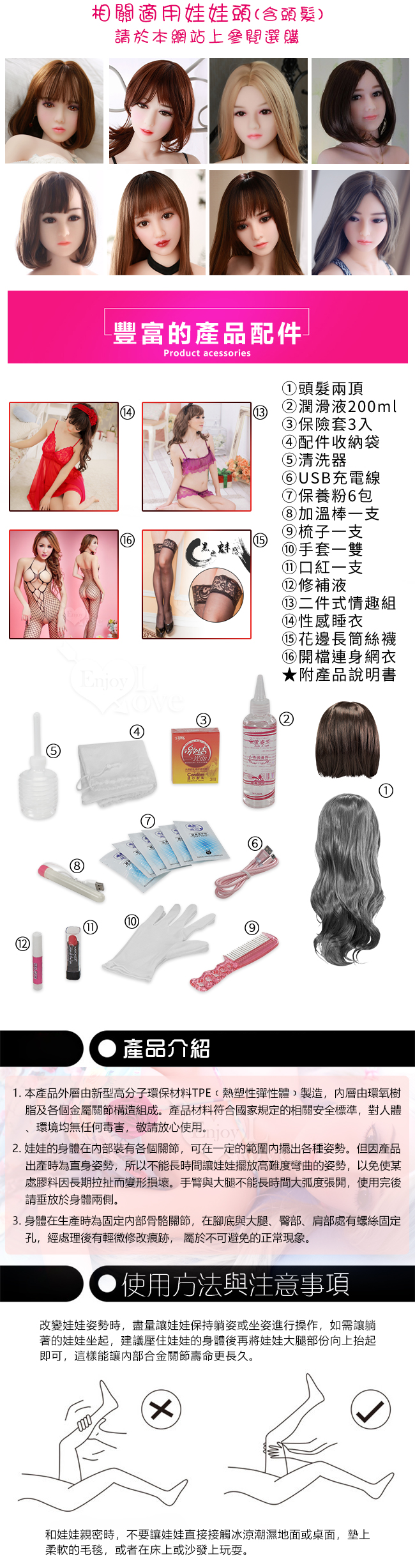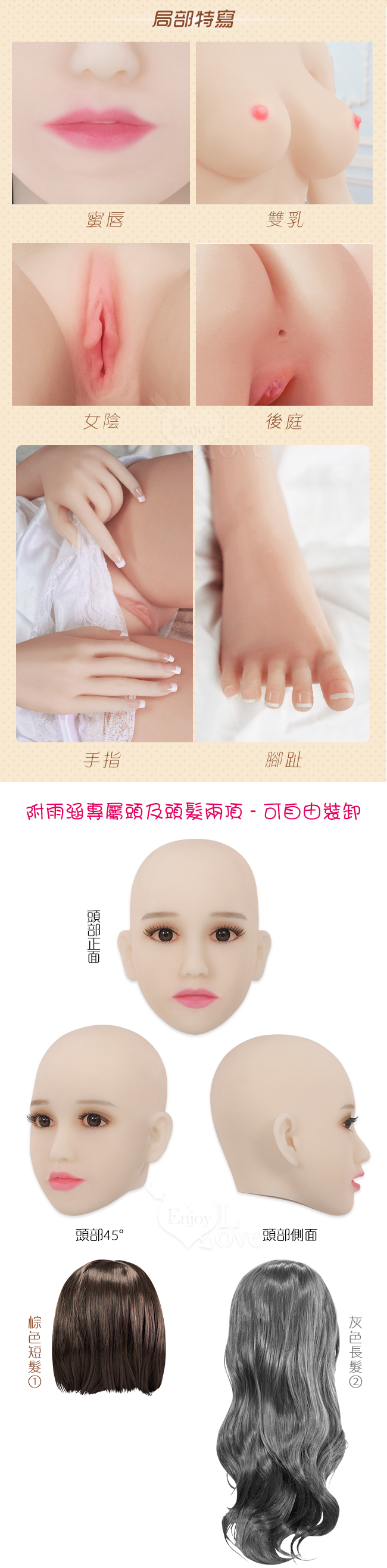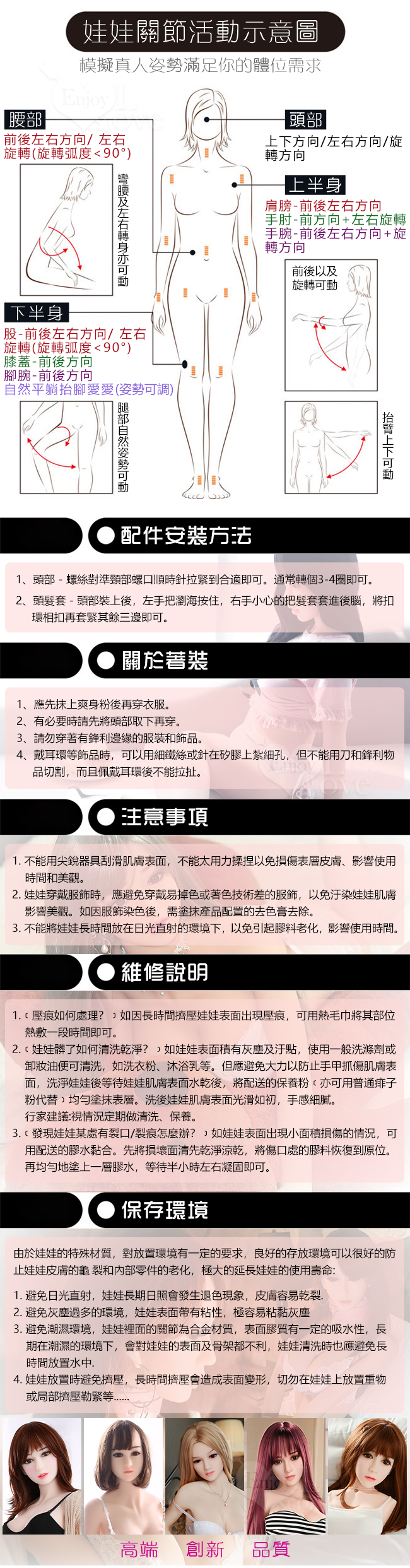 使用部位:陰交、肛交、口交、乳交四種性交用法,內置合金骨骼可固定姿勢,關節可動,可隨意變更姿勢