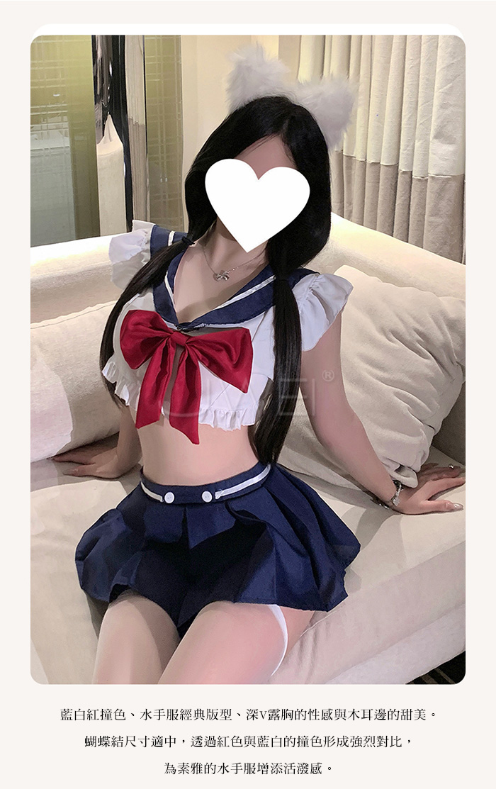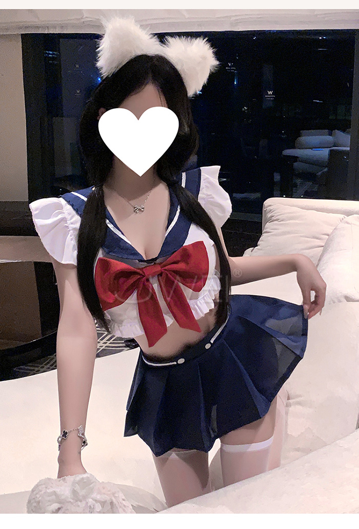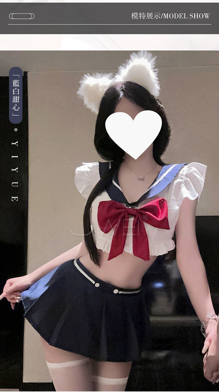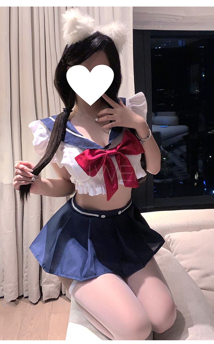 ►您現在的位置:首頁>藍白甜心.深V露胸百褶裙擺純欲甜美水手服套裝【上衣+蝴蝶結(可拆)+短裙+T褲】