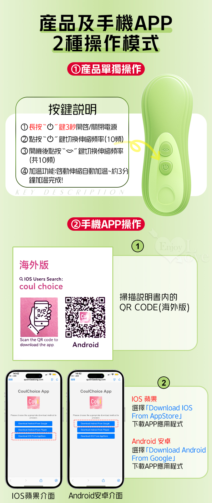 ►您現在的位置:首頁>ROSELEX 勞樂斯 ‧ 識趣 10變頻伸縮+震動/吮吸內外齊歡智能加溫按摩器 - 可手機APP遙控﹝具兩種操控模式﹞綠色