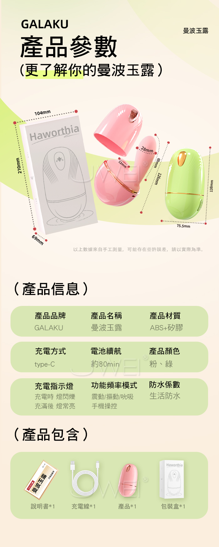 ►您現在的位置:首頁>GALAKU.曼波玉露 10頻靈指摳動+大口吮吸 雙潮喚起智能遠控變頻跳蛋【綠色】
