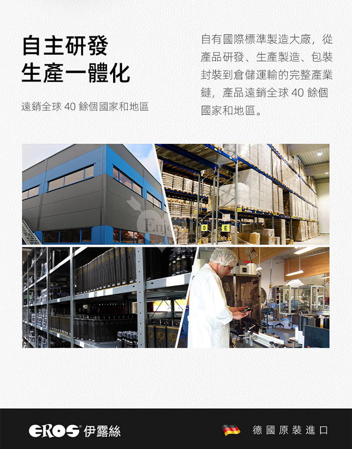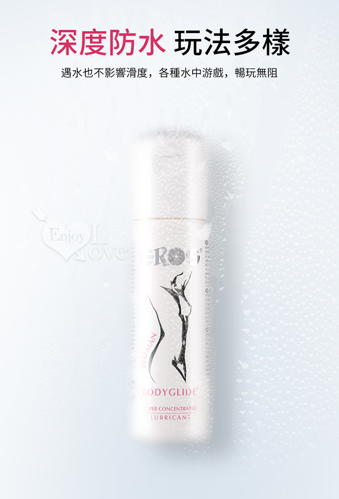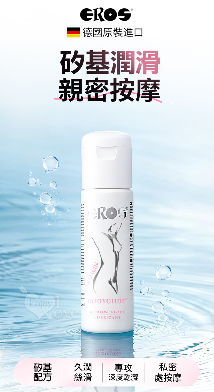 說明: • EROS 女性超濃縮身體潤滑液是一款矽基潤滑劑,專為幹性及敏感性肌膚女性的需求定制。 • 本產品亦可用於按摩,安全性高。 使用方法: 按需取適量 EROS 女性身體潤滑液,塗抹於需補充滋潤的身體部位,使用頻率可根據自身需求調整。 成分:聚二甲基矽氧烷、聚二甲基矽氧烷醇、環聚二甲基矽氧烷等 ‧ 產地:德國原裝進口 ‧ 容量:100ml ‧ 保質期:5年 ‧ 保存期限:請見瓶身底部