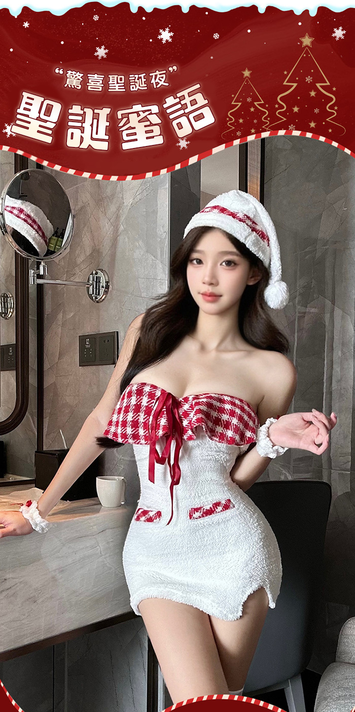 ►您現在的位置:首頁>夢夜覆雪.紅白格紋平口裹胸白色毛絨修身包臀連身裙套裝【帽子+連身裙+手環】