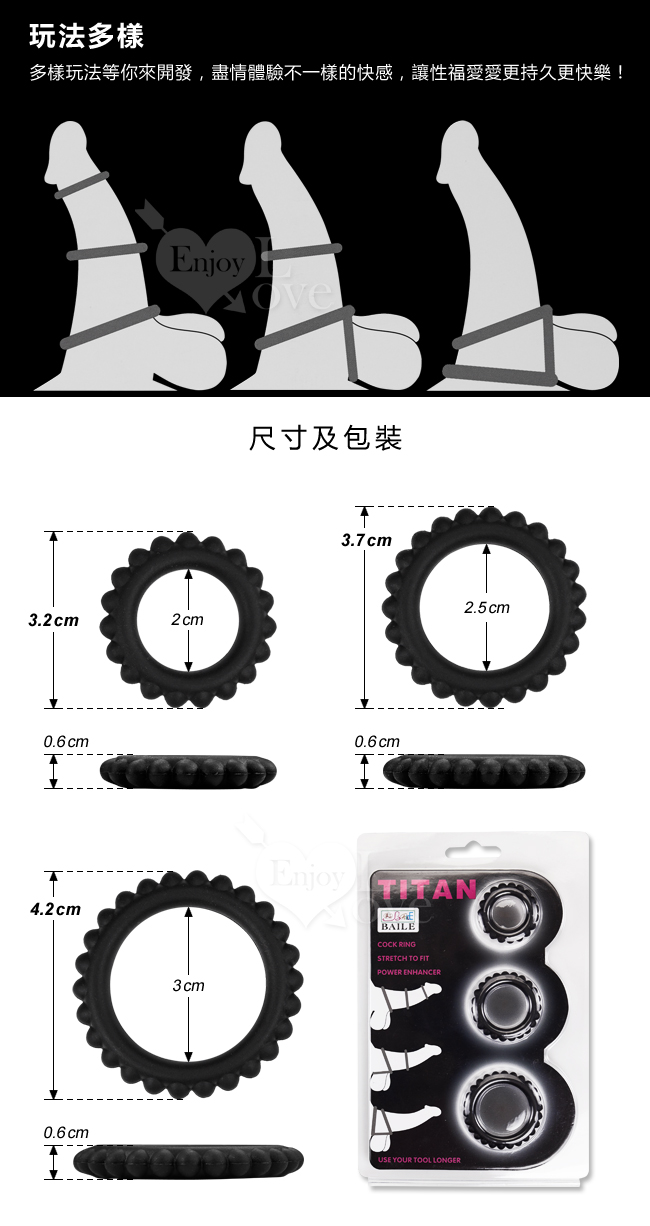 首頁>【BAILE】TITAN 猛男鎖精持久三套裝凸齒環 - A款
