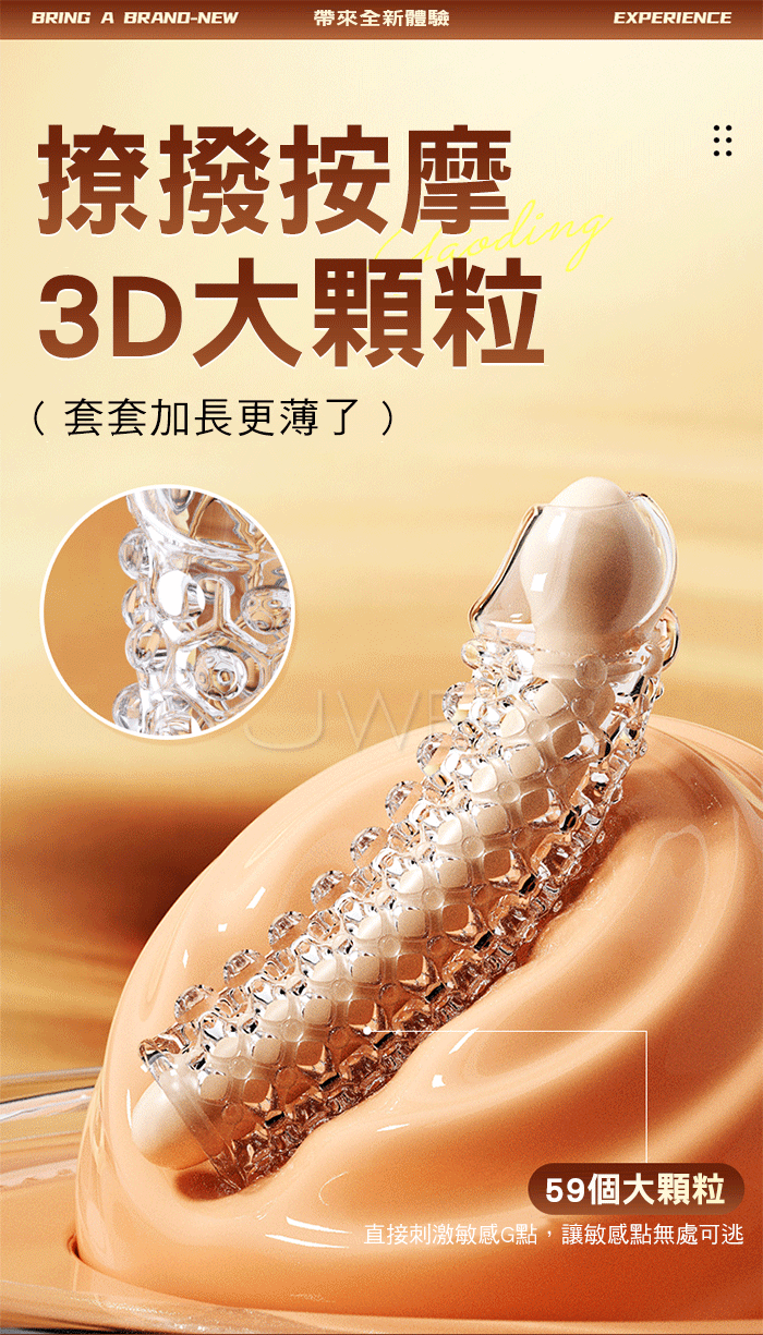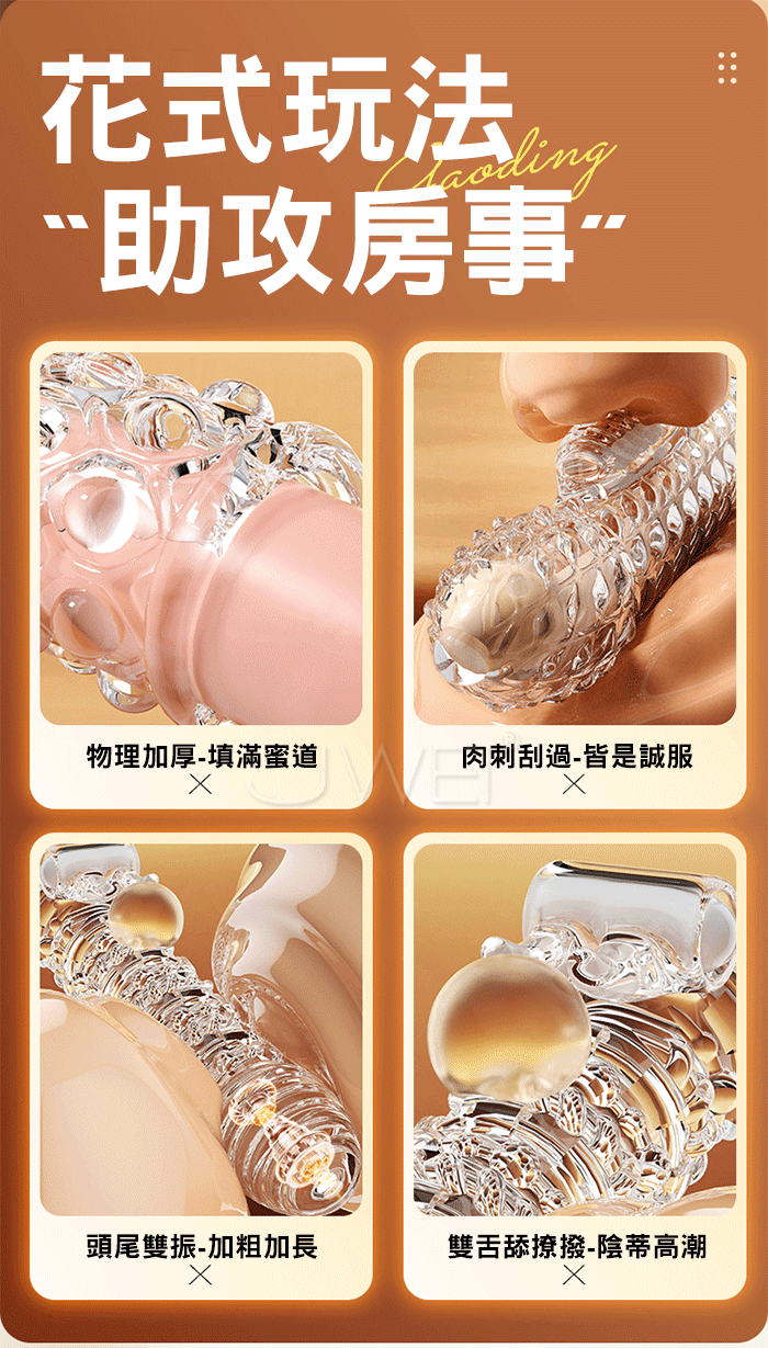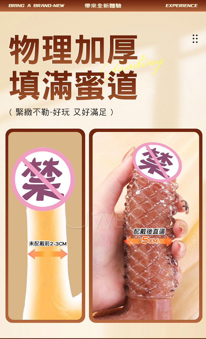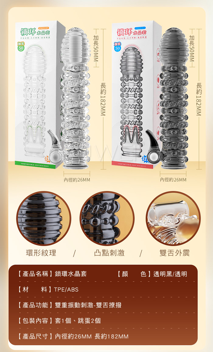 情趣至上 大顆粒刺激創新狼牙套 刺激的她心裡歡喜 又薄又彈不易破,緊繃感十足不脫落,肆意愛欲放肆 物理加厚,填滿蜜道,降敏加時,提升戰鬥力!! 產品規格 ■尺寸:大小詳如圖片標示 ■材質:TPE/ABS ■特點:雙震刺激 ■供電:LR1130鈕扣電池*6