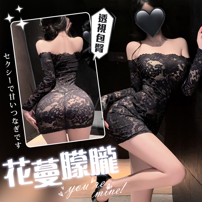 花蔓朦朧.蕾絲雕花一字領透視包臀睡裙【連身裙+T褲+隱形肩帶-黑色】