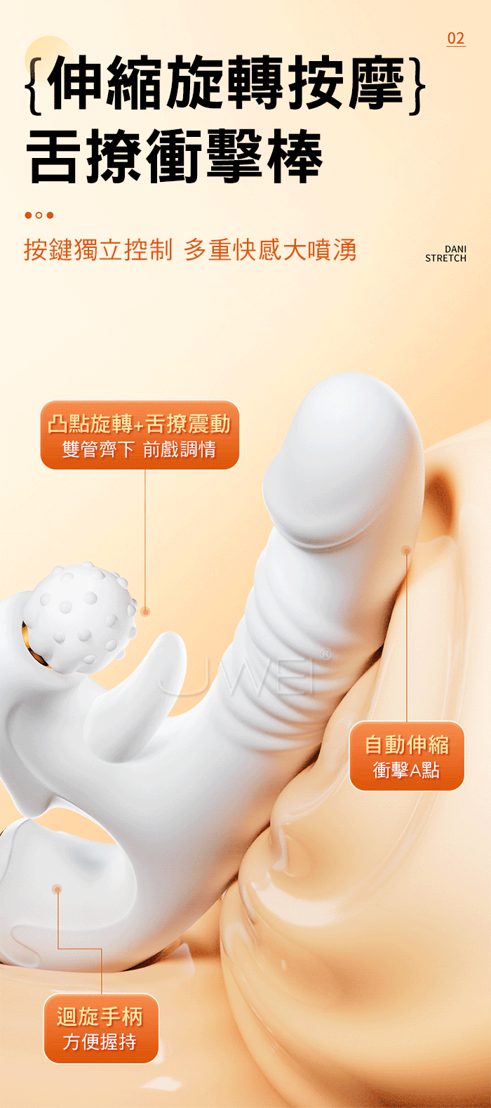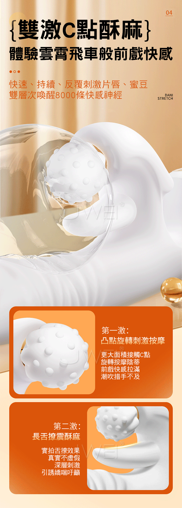 [丹妮伸縮舌舔]轉珠震動棒,專為追求更強高潮快感女性研發 舌撩衝擊+凸點旋轉蹂躪,超爽雙激C點酥麻,雲霄飛車般的快感體驗! 長距伸縮深入引爆衝擊快感,專為亞洲女性設計,填滿深處的緊實且不撐大 產品規格 ■材質: ABS+矽膠 ■規格: 詳如圖片標示 ■特色: 8頻旋轉、8頻震動、8頻伸縮、8頻舌舔、加溫