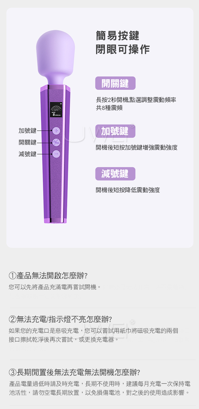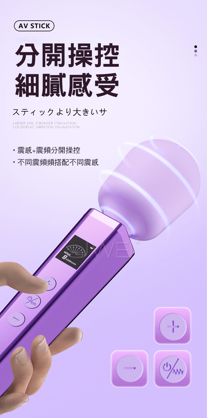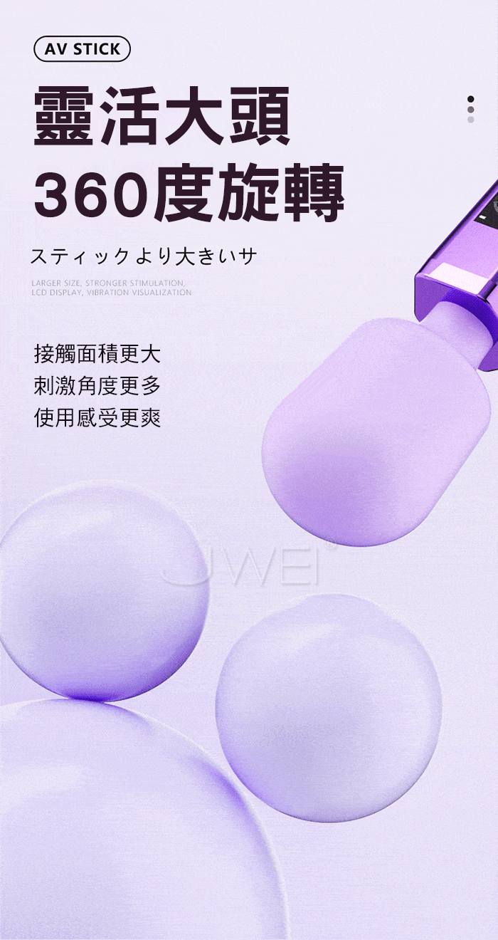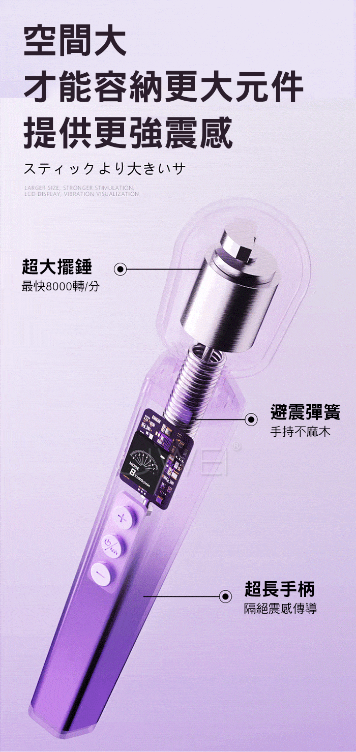 迅潮大AV棒,強震陰蒂,迅潮淪陷,無法抗拒的震震高潮體驗 雙重減震,手持不麻木,減震彈簧+超長手柄 雙管齊下阻絕震感 靈活大頭,360度旋轉 接觸面積更大,刺激角度更多,使用感受更爽 高階液晶顯示器,可視化快感衝擊,液晶螢幕即時顯示,見證高潮來襲時的強度數據 產品規格 ■材質: 矽膠+ABS ■規格: 詳如圖片標示 ■功能: 8頻震動、8級強度