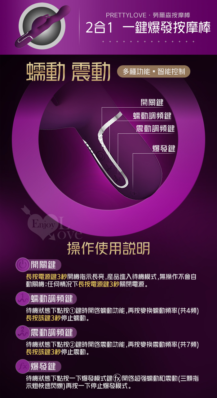 | 派蒂菈 ‧ Loursen 勞爾森 4蠕動+7震動 瘋狂蠕動震感內外夾擊入體按摩棒-深紫 優惠價 $1,264 | ||