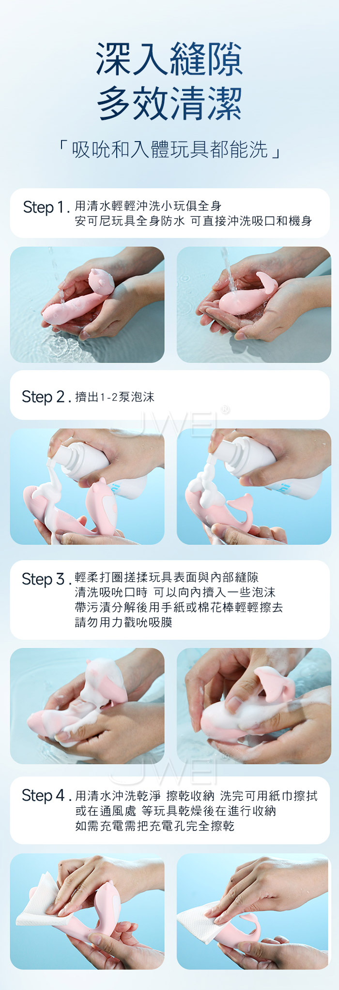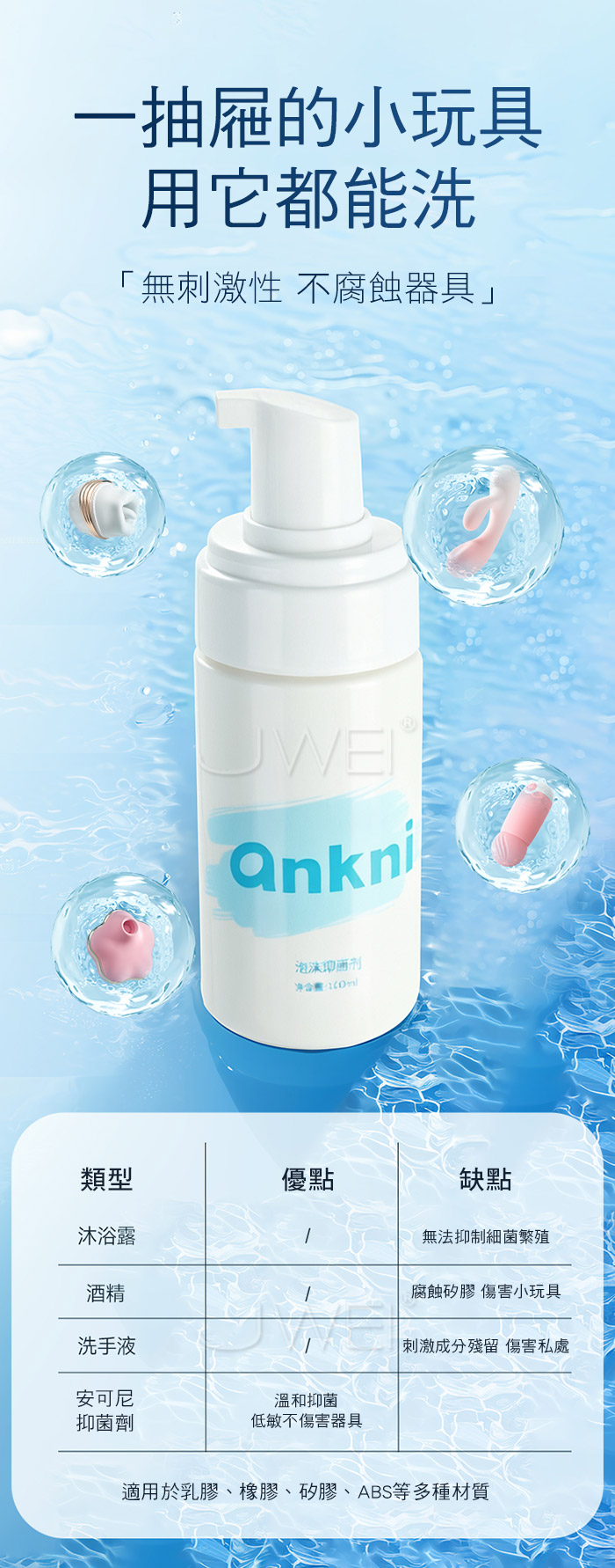 清潔抑菌,護理更簡單便捷,深度清潔淨享愉悦 一抽屜的小玩具,用它都能洗,無刺激性不腐蝕器具 慕斯般的綿密泡沫,可觸及每個凹槽和紋路,迅速包裹污垢 發揮全面抑菌效果,清水一沖即淨,無需等待馬上使用 ●容量:100ml。 ●規格:含椰油成分溫和不傷手。 ●性質:綿密慕斯般泡沫。