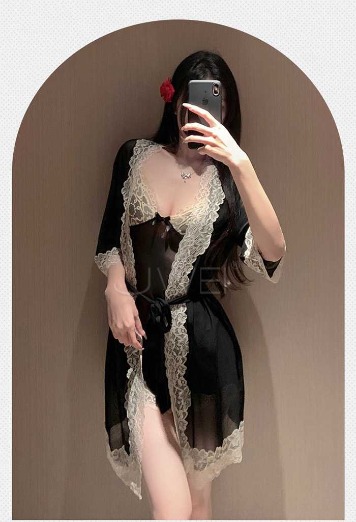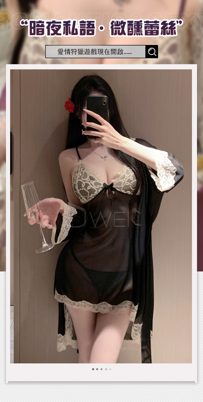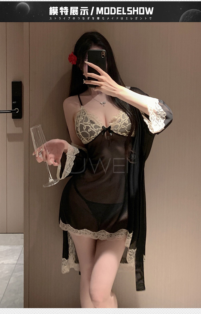 微醺蕾絲.性感深V露溝睫毛蕾絲覆胸美背睡裙-黑色【外袍+睡裙+T褲】