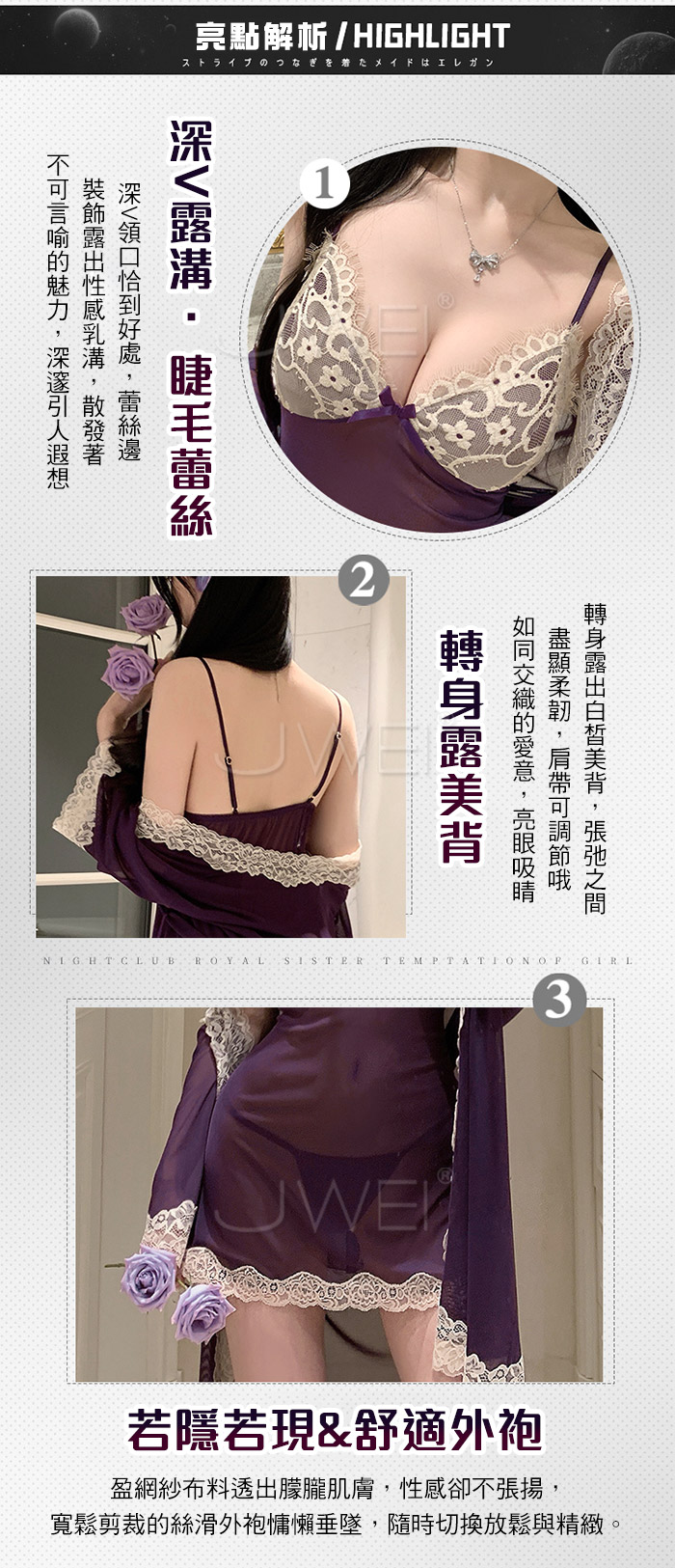 ►您現在的位置:首頁>微醺蕾絲.性感深V露溝睫毛蕾絲覆胸美背睡裙-黑色【外袍+睡裙+T褲】