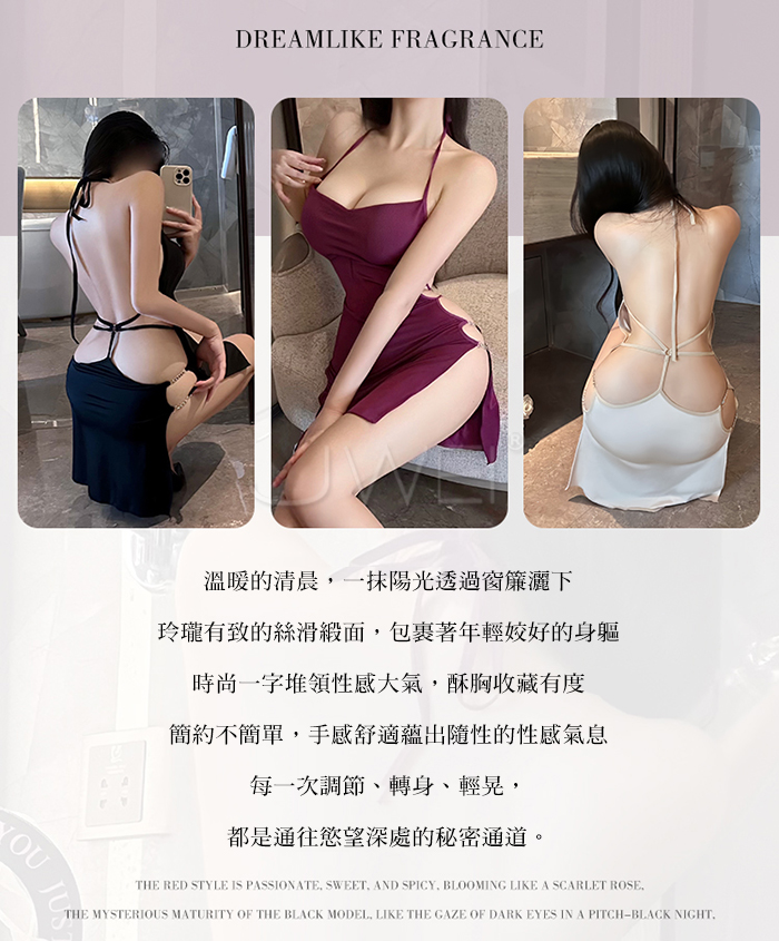 ►您現在的位置:首頁>綺夢暗香.優雅蕩領美背綴腰掛脖後繫帶睡裙【紫棠色】
