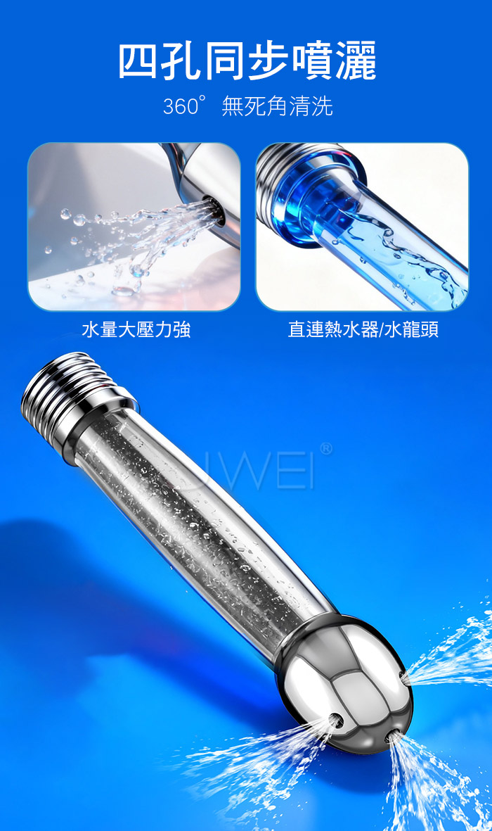 4孔雙槽男女通用沖洗器,金屬肛陰沖洗,爽滑易入,可伸入體內清洗 連接家用淋 浴軟管即可使用,安裝方便!人體工學流線型設計舒適握把 時尚外觀,防潮防鏽歷久 如新~單手即可操做 擁有4孔設計噴頭, 一體成型,讓水流分散更柔和避免肌膚受到刺激~ ■尺寸:大小詳如圖片標示 ■材質:金屬 ■特色:清洗私密處