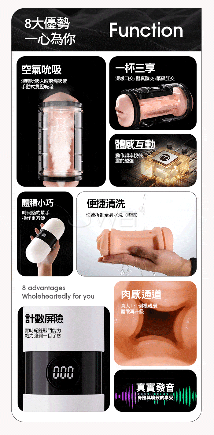 口陰肛貫通三穴,1杯3玩,實標不完虛一杯爽玩 智能芯片,感應式強震,動的越快它越強!! 暴風級吮吸,深度入喉,手動式負壓吮吸 3國女優真人錄製,激情吟叫,身臨其境般 ■尺寸:大小詳如圖片標示 ■材質:TPE+ABS ■特色:雙頭、三穴、計數、12頻感應式震動、發音 ■小提醒:陰/口通道為貫通,肛部通道不貫通