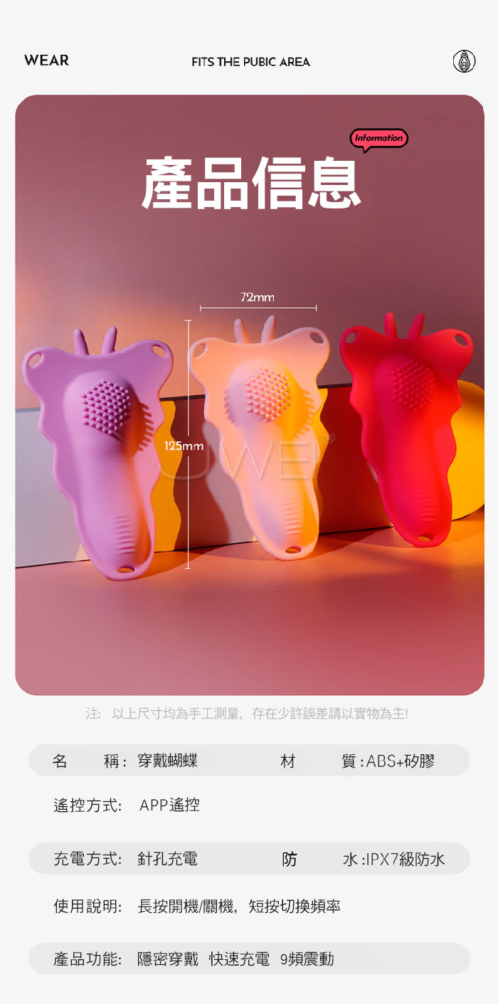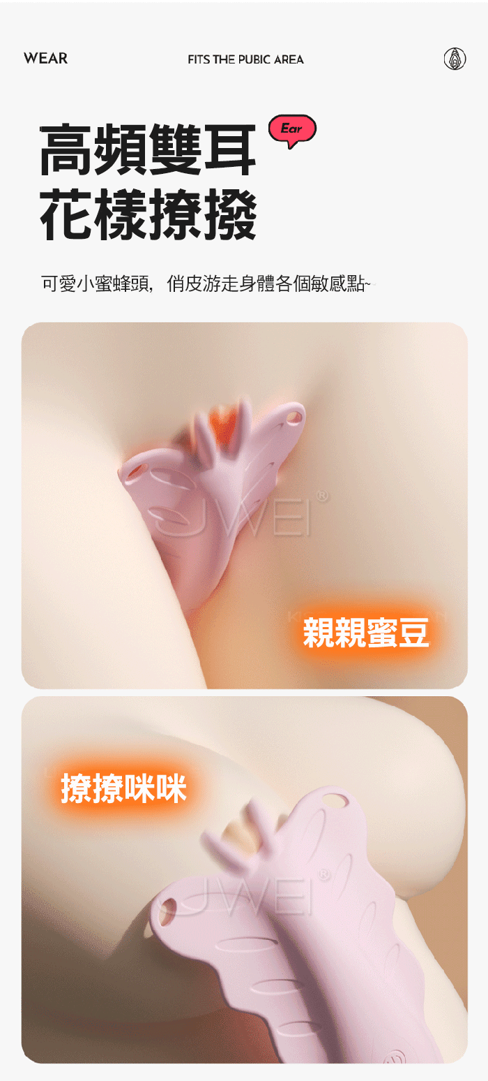 穿戴出街,遠程遥控,貼合陰部 不傷私處,少女也能用 高頻雙耳 花樣撩撥,可愛小蜜蜂頭,俏皮游走身體各個敏感點 一穿快感就來了,貼合私處覆蓋C點及陰道口,快感由一點到全身 產品規格 ■尺寸: 大小詳如圖片標示 ■材質: TPE+ABS ■特色: 9頻震動、APP智控