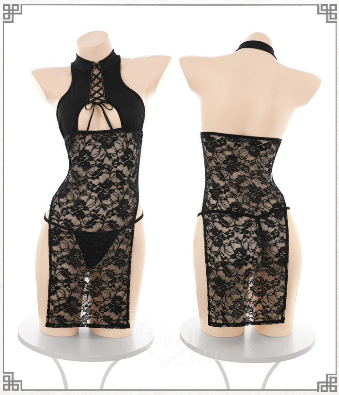 ►您現在的位置:首頁>仿旗袍睡衣|立領綁帶緹花蕾絲・側高衩性感連身裙三件組