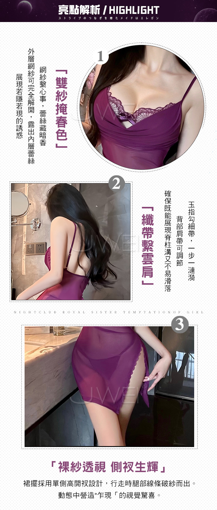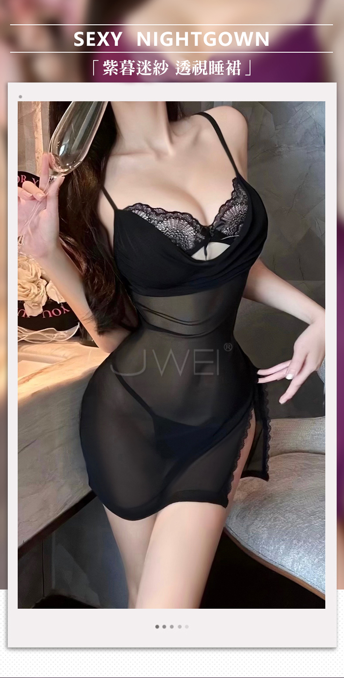 ►您現在的位置:首頁>月暮迷紗.性感裸紗蕩領透視側開衩細肩帶美背睡裙【睡裙+T褲-黑色】