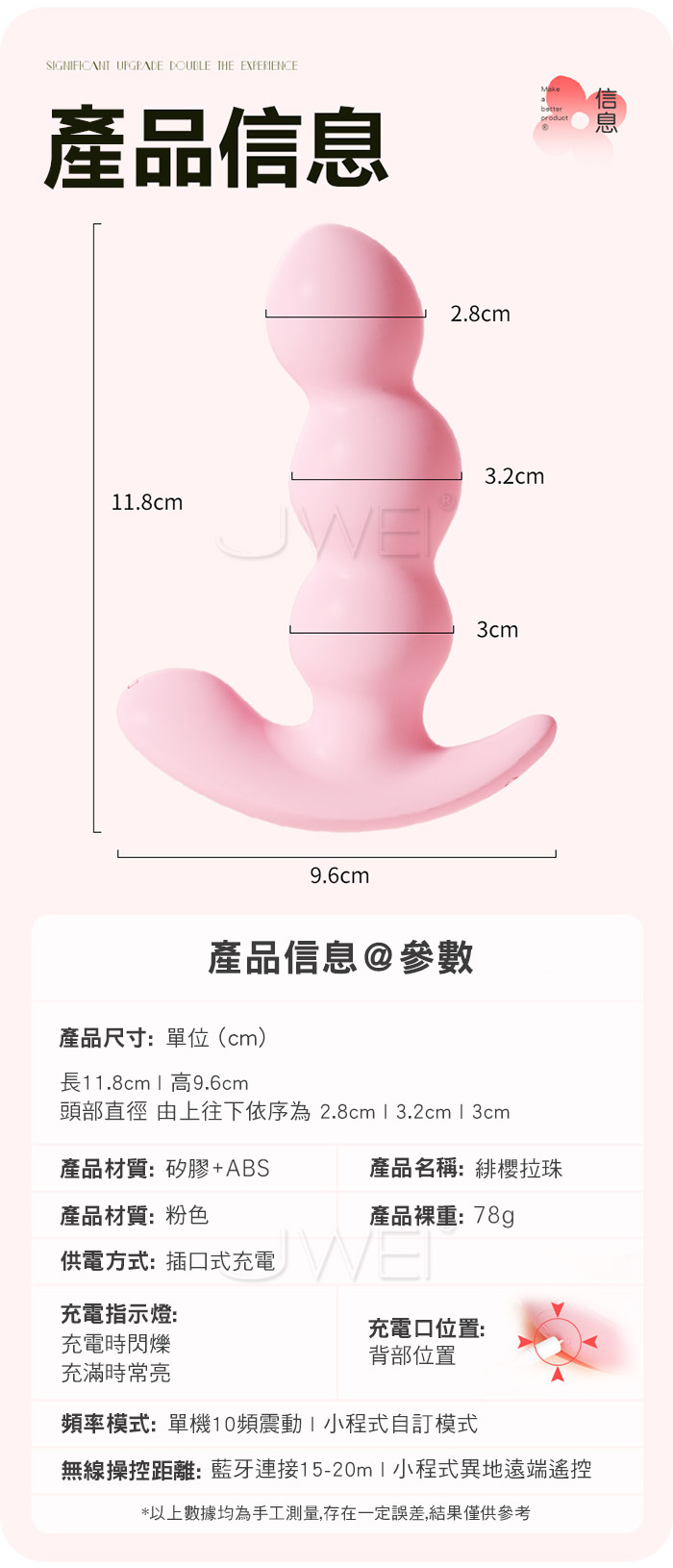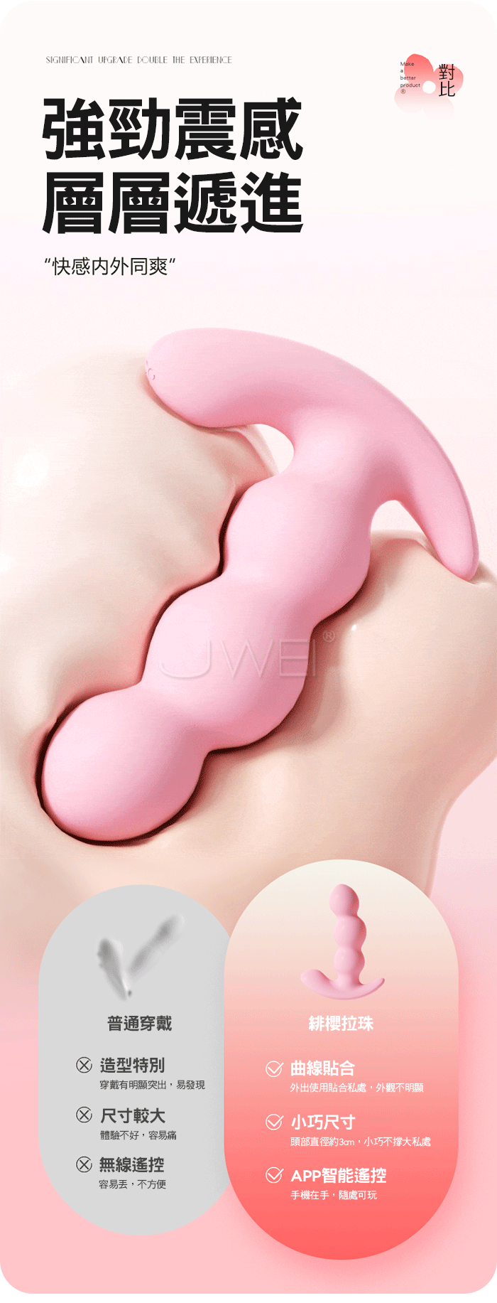 緋櫻拉珠 新手爽玩!10頻強勁震感 層層遞進! 軟糯矽膠,舒適入體“柔軟不疼”外震蜜豆,挑逗咪咪 遠程控制,指尖把玩“距離不在是難題” 產品規格 ■材質: 矽膠+ABS ■規格: 詳如圖片標示 ■功能: 10頻震動、APP智控