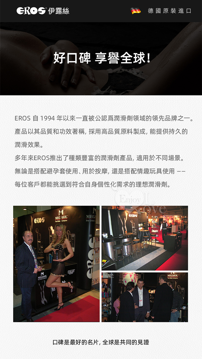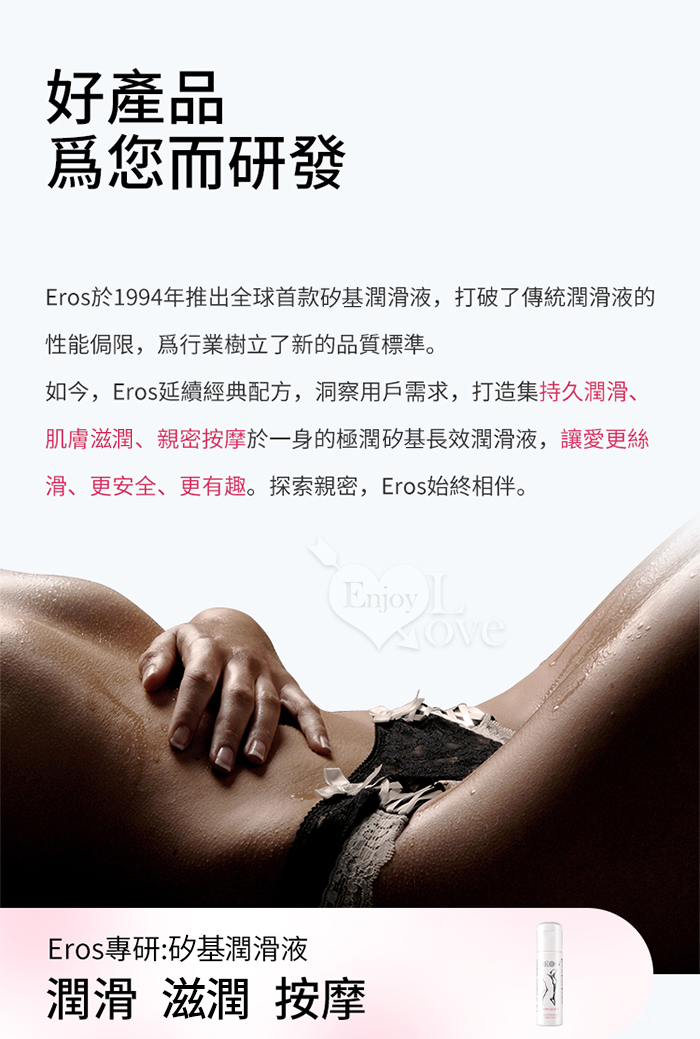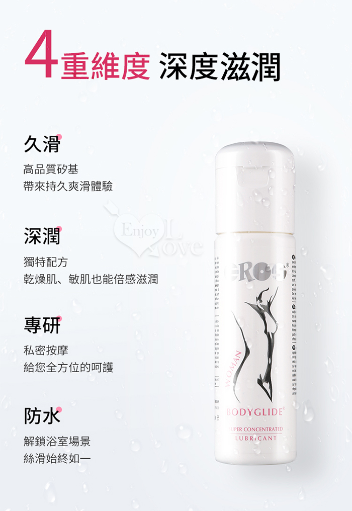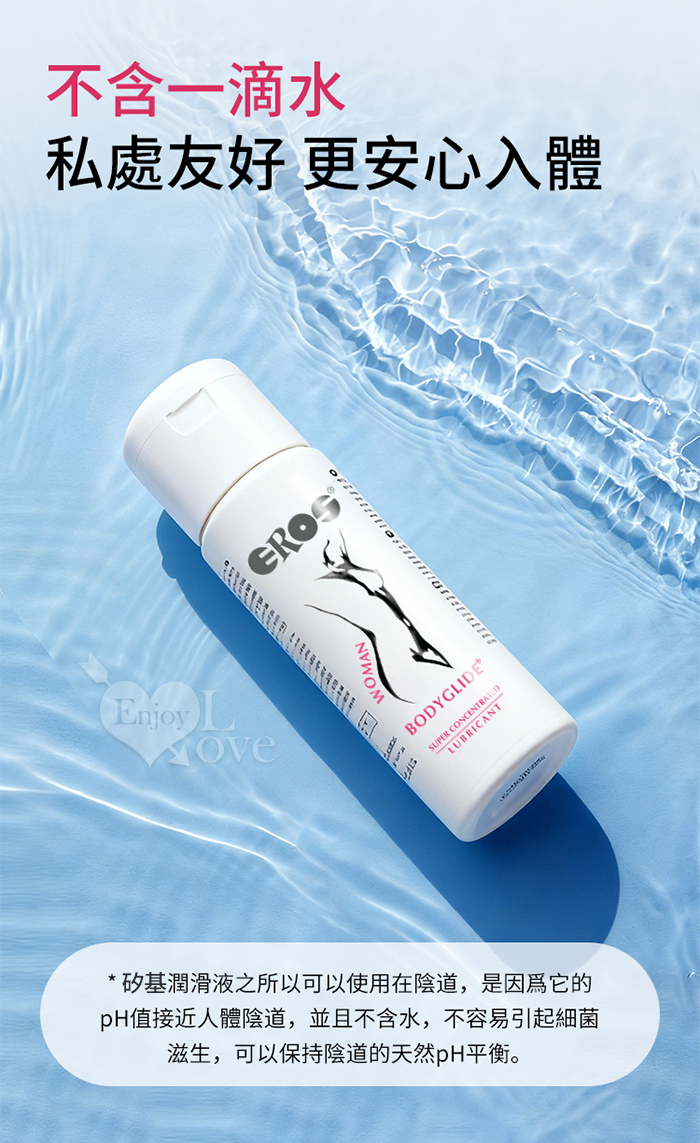 說明: • EROS 女性超濃縮身體潤滑液是一款矽基潤滑劑,專為幹性及敏感性肌膚女性的需求定制。 • 本產品亦可用於按摩,安全性高。 使用方法: 按需取適量 EROS 女性身體潤滑液,塗抹於需補充滋潤的身體部位,使用頻率可根據自身需求調整。 成分:聚二甲基矽氧烷、聚二甲基矽氧烷醇、環聚二甲基矽氧烷等 ‧ 產地:德國原裝進口 ‧ 容量:100ml ‧ 保質期:5年 ‧ 保存期限:請見瓶身底部
