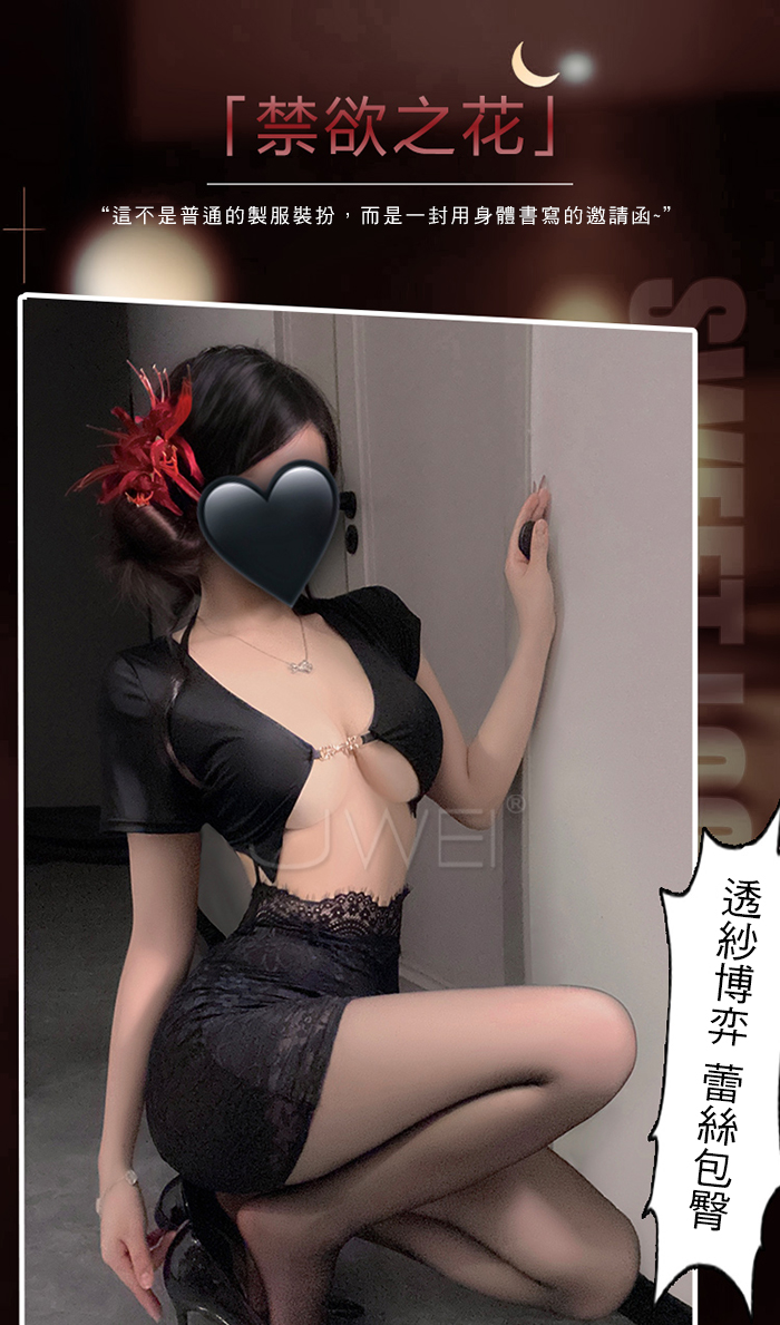 | 禁欲之花.性感開胸露乳花蔓蕾絲透膚包臀輕熟秘書裝【短上衣+連身裙+T褲】