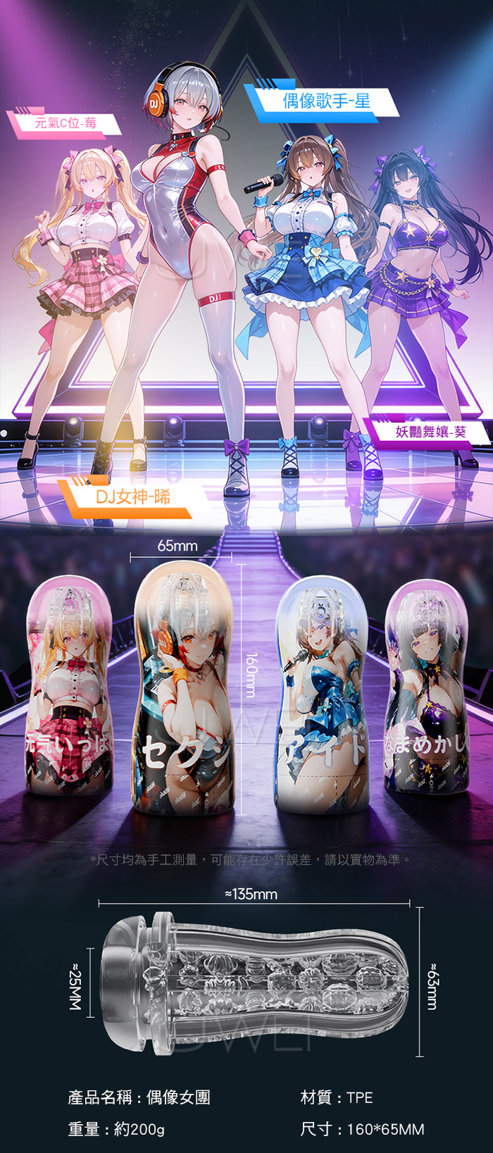 偶像女團系列飛機杯採用TPE軟膠材質,更加貼近真人成覺 不僅能體驗到真實包裹般舒爽·還能降低你的敏感,為以後實戰一振雄風! 快來PICK你的心選姐姐!四種通道,理想伴侶 各有百般妙處~~ 產品規格 ■尺寸:大小詳如圖片標示 ■材質:矽膠+ABS