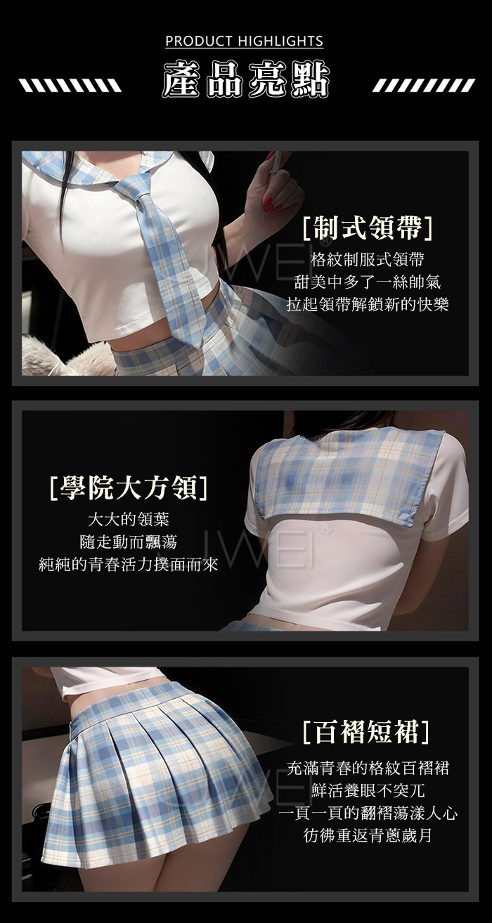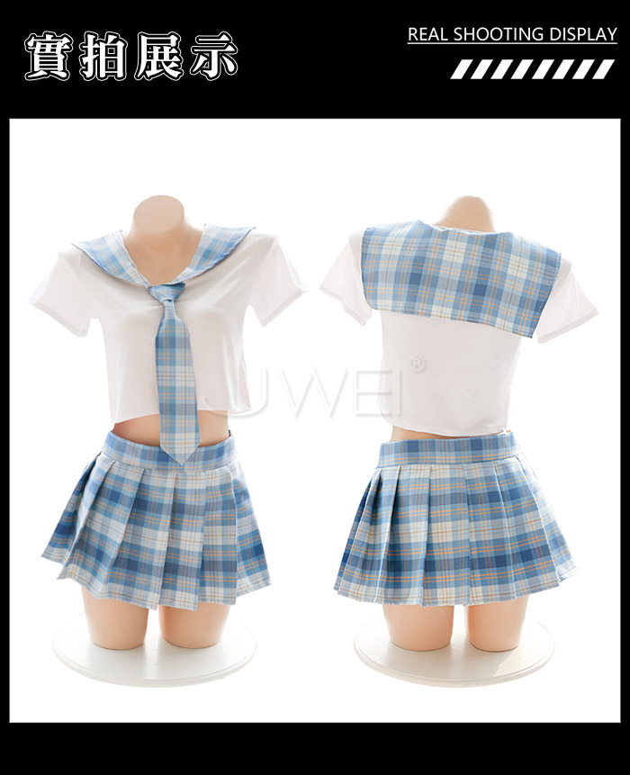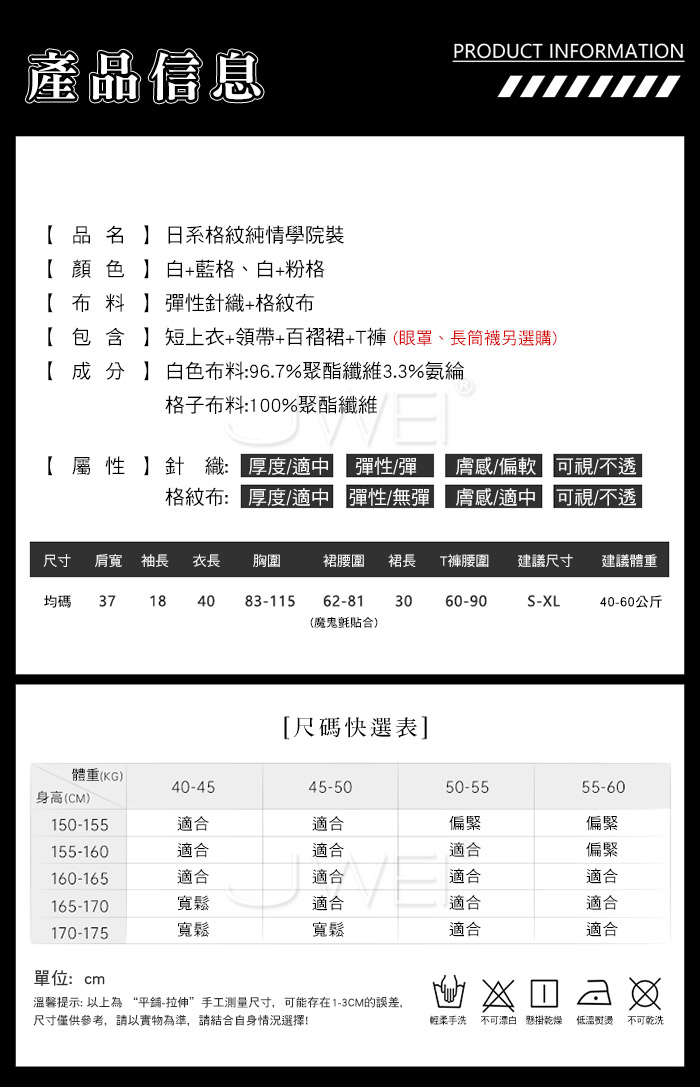■內容物:短上衣+領帶+百褶裙+T褲 ■適穿尺寸:FREESIZE ■彈性:針織-彈、格紋布-無彈 ■未撐開平量尺寸正負誤差1~2cm,1吋=2.54cm ■注意事項:基於保障消費者個人衛生,此貼身衣物恕不接受退換貨。 (如為商品本身暇疵,接受七日內換貨,請勿試穿,謝謝您)
