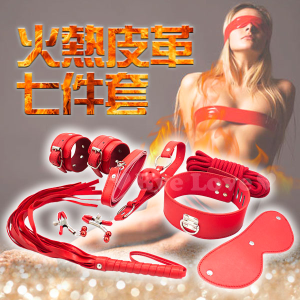 滿3000元贈品 SM 火熱皮革情趣7件套-紅/黑色(眼罩+手銬+皮鞭+棉繩+口塞+乳夾+脖圍)